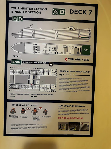 The cabin had 2 Australian power points.The muster station was D and is in Black Circus.